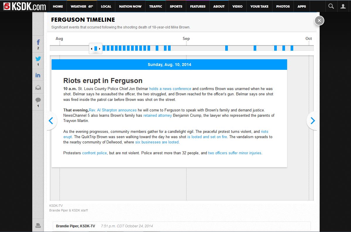 Timeline: Unrest in Ferguson Posted bybrandiepiperOctober 30, 2014June 12, 2020Posted inCrime, Ferguson, newsTags:darren wilson, Ferguson, michael brown, timeline By Brandie Piper This was an interactive timeline of the unrest that erupted in Ferguson, Missouri following the shooting death of Michael Brown. Published Oct. 24, 2014 on KSDK.com. Like Loading... Related